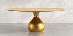 Unser exquisiter Esstisch aus massivem Ahorn kombiniert natürliche Eleganz mit modernem Design. Die in runder oder ovaler Form gestaltete Tischplatte hebt die feine Maserung des Ahorns hervor, was jedem Tisch eine exklusive, individuelle Note verleiht. Der kunstvoll geschwungene, tropfenförmige Fuß bildet das Herzstück des Designs und verleiht dem Tisch eine kunstvolle und doch stabile Basis.