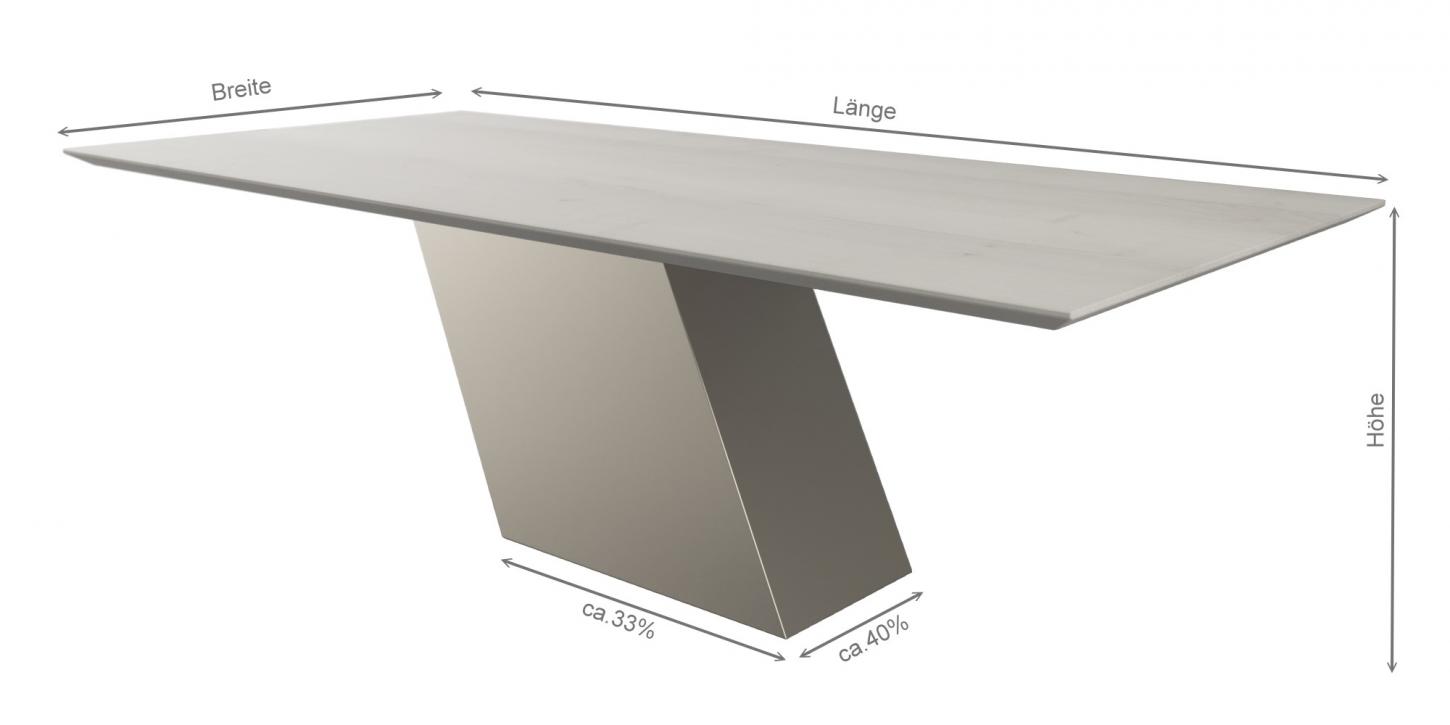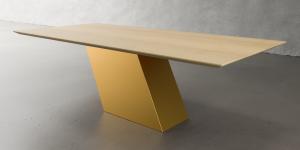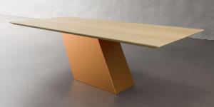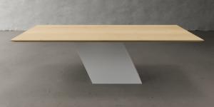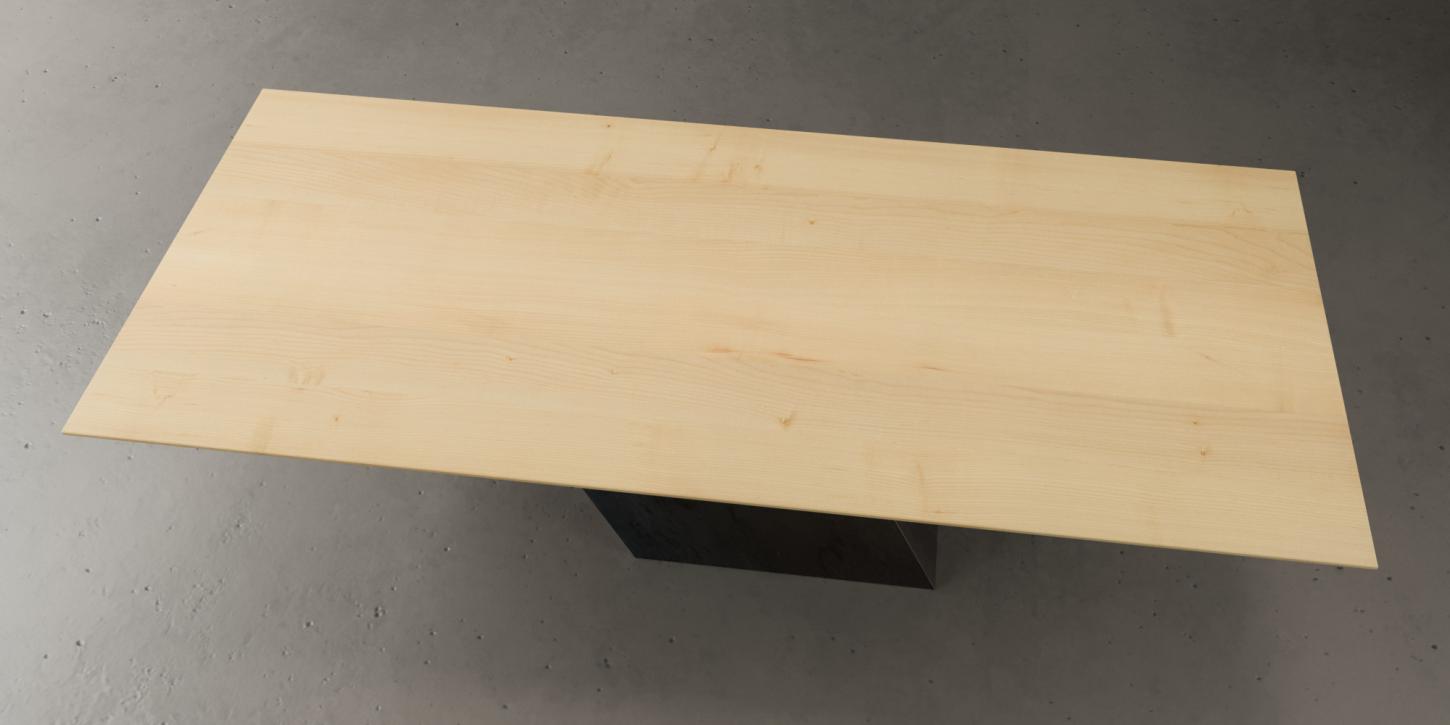 Präsentiert in strahlender Pracht: der Luxus Esstisch aus Ahorn. Die edle Ahornoberfläche, reich an warmen Tönen und subtilen Maserungen, steht im Kontrast zur avantgardistischen diagonalen Metallsäule, die sich in Schwarzstahl, Edelstahl oder in Ihrer Wunschlackierung zeigt.