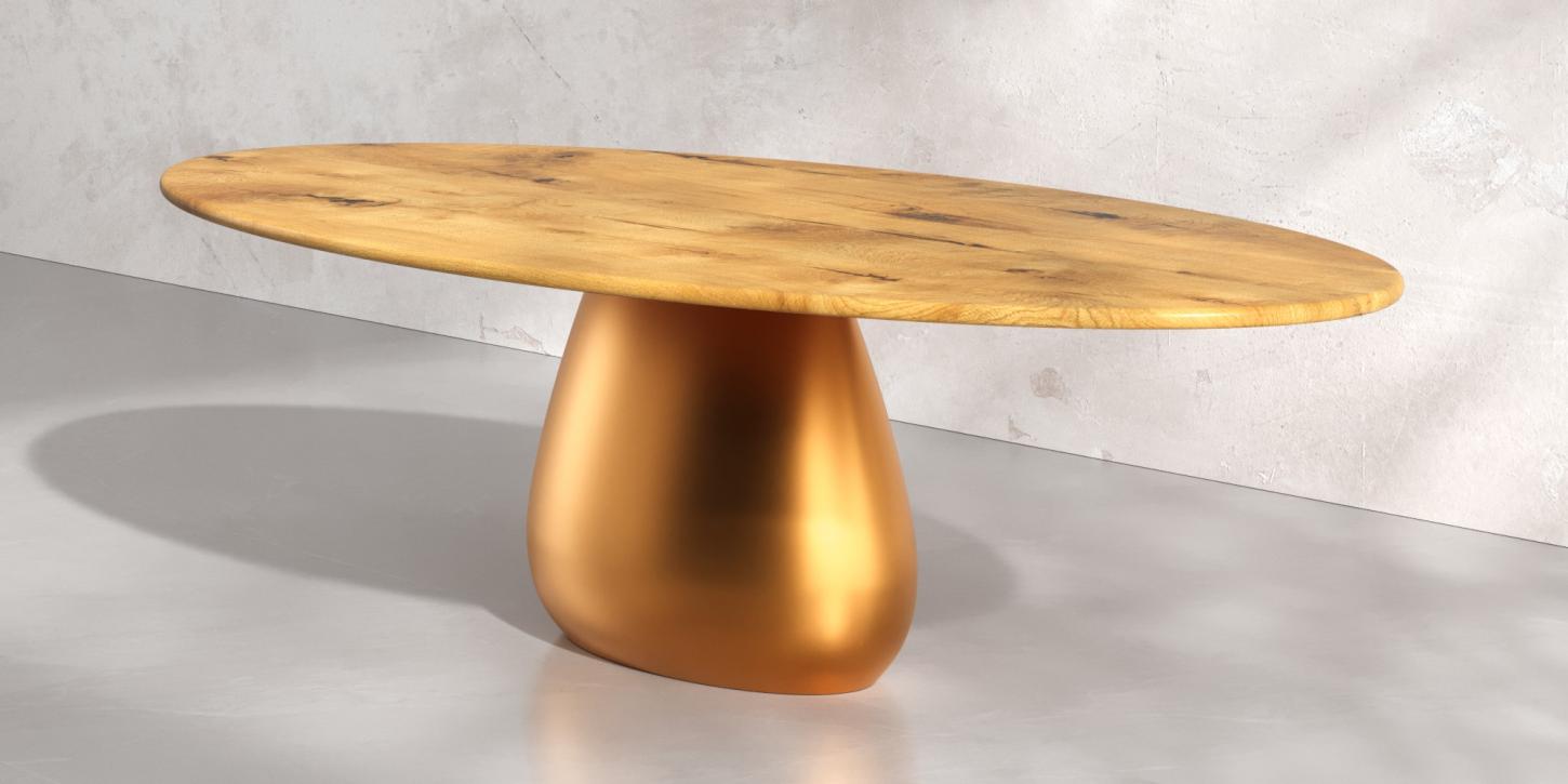 Das massiv gearbeitete Untergestell aus Asteiche fügt sich perfekt in das Gesamtbild ein. Die abgerundete Basis verjüngt sich elegant nach oben und verbindet sich fließend mit der Tischplatte. Diese robuste Konstruktion sorgt nicht nur für Stabilität, sondern betont auch die Natürlichkeit des Designs. Ideal für alle, die eine Kombination aus rustikalem Charme und moderner Formensprache suchen.