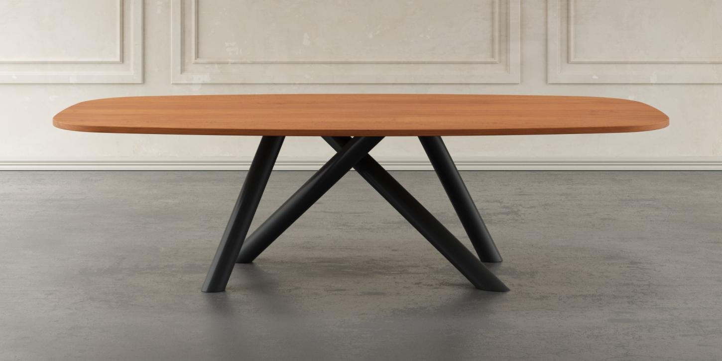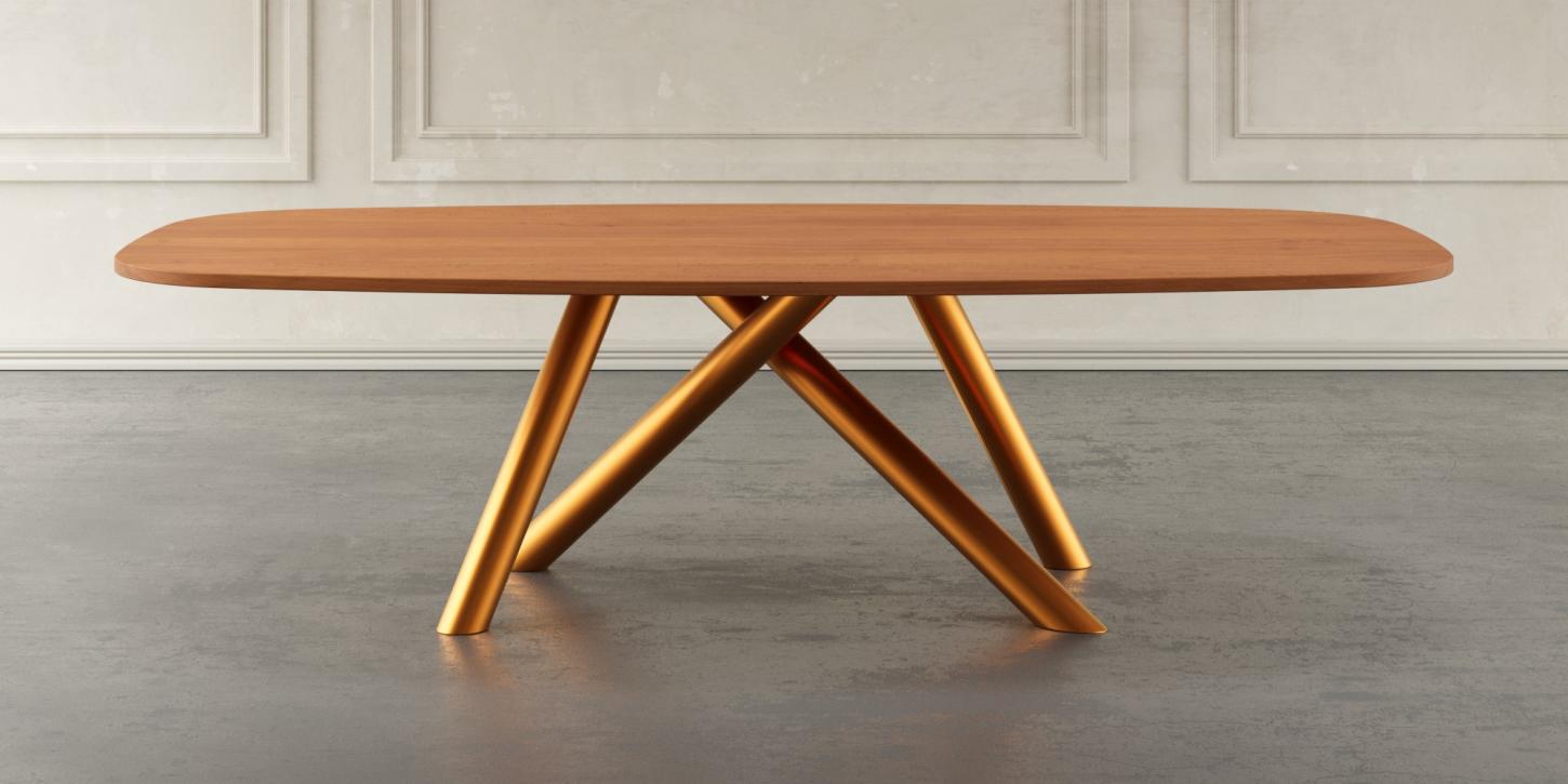 Das elegante Gestell, geformt wie Schmetterlingsflügel, besteht aus zwei geschwungenen Metallbeinen. Die Auswahl zwischen Stahl, Edelstahl oder einer lackierten Wunschfarbe ermöglicht Ihnen, den Tisch perfekt an Ihr Ambiente anzupassen.