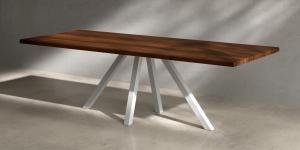 Das Gestell aus Schwarzstahl bildet einen modernen Gegenpol zur klassischen Eleganz der Nussbaumplatte. Ob in poliertem Edelstahl oder in einer farbig lackierten Variante, die vier Metallstreben, die sich sternförmig ausbreiten, bieten eine stabile Grundlage und fügen dem Tisch einen Hauch zeitgenössischer Raffinesse hinzu.