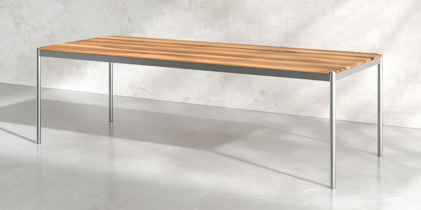 Das moderne Metallgestell bietet einen spannenden Kontrast zur natürlichen Holzstruktur und verleiht dem Tisch eine schwebende Eleganz. Die schlanken, runden Beine sorgen für Stabilität und betonen gleichzeitig das minimalistische Design, das sich ideal in moderne oder kleinere Räume einfügt. Sie können zwischen Edelstahl, Rohstahl oder einer individuellen RAL-Farbe wählen, um den Tisch perfekt an Ihre Einrichtung anzupassen.