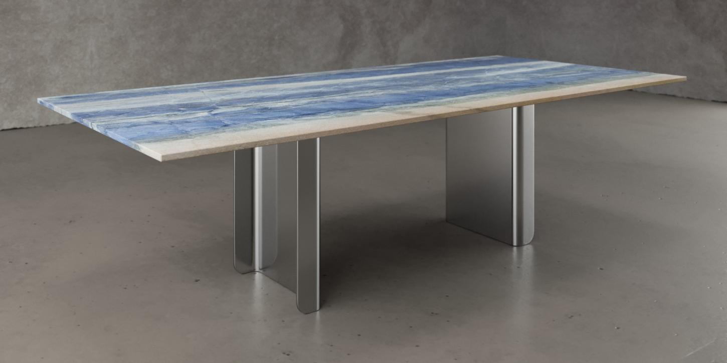Im Zentrum steht die prachtvolle Tischplatte aus Azul de Mare, einem hochgeschätzten Naturstein, bekannt für seine faszinierende Maserung und das lebendige Farbspiel aus Blau- und leichten Grautönen. Diese Platte ruht auf einem filigranen, jedoch robusten Gestell aus wahlweise Schwarzstahl, Edelstahl oder individuell farbig lackiertem Material. Die kufenartigen, schlanken Beine sorgen nicht nur für eine stabile Grundlage, sondern unterstreichen auch die schwere Optik der Platte und schaffen eine harmonische Balance.