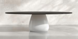 Das massive, abgerundete Untergestell ist ein wahres Kunstwerk. Es verjüngt sich sanft nach oben und fügt sich nahtlos in die Tischplatte ein. Diese Designlösung verleiht dem Tisch nicht nur Stabilität, sondern auch eine moderne und dynamische Ausstrahlung. Ideal für designbewusste Kunden, die sowohl Funktionalität als auch Ästhetik schätzen.