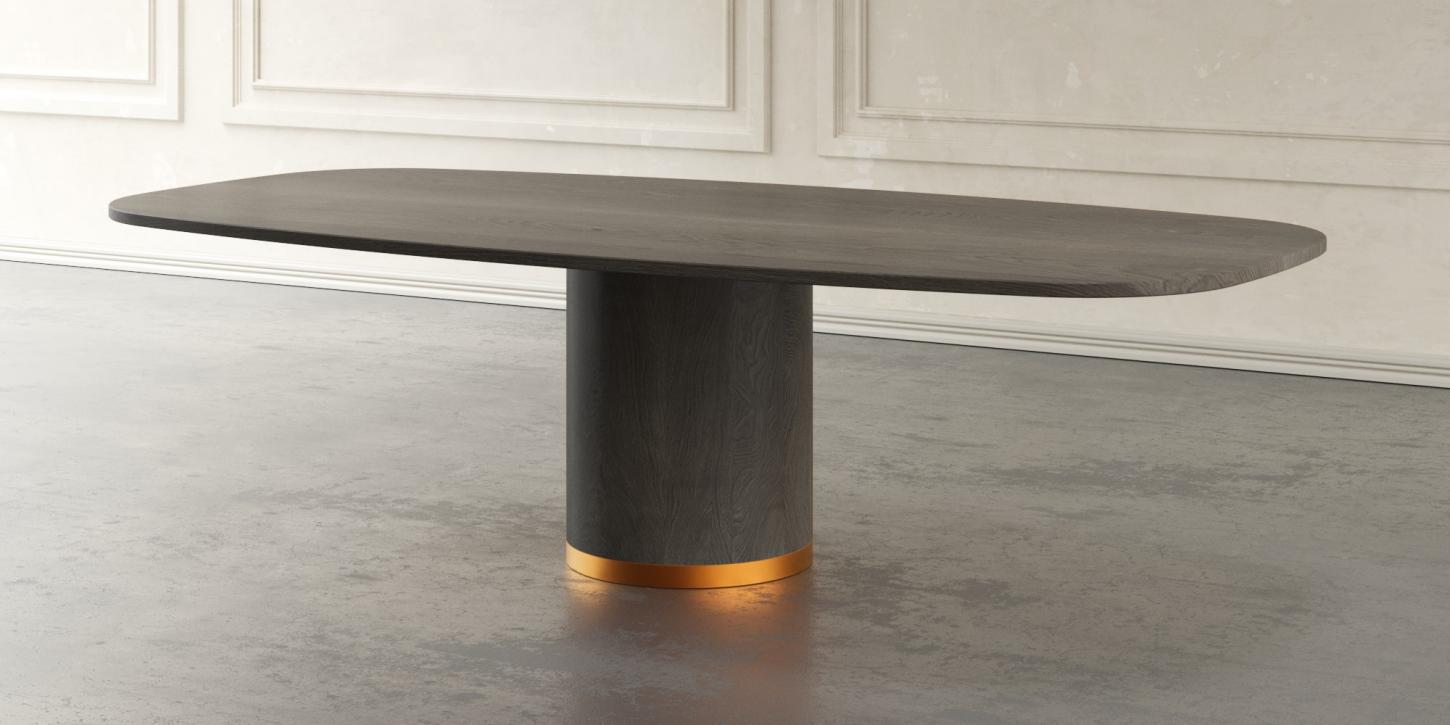 Unterstützt wird die Tischplatte von einem zylindrischen Standfuß aus grauer Eiche, der zentral positioniert ist und eine stabile Grundlage bietet. Diese Bauweise sorgt nicht nur für hohe Standfestigkeit, sondern gewährleistet auch eine großzügige Beinfreiheit für alle Sitzplätze. Ein subtiler, lackierter Rand am unteren Ende des Standfußes rundet das minimalistische Design ab und setzt einen dezenten, aber wirkungsvollen Akzent.