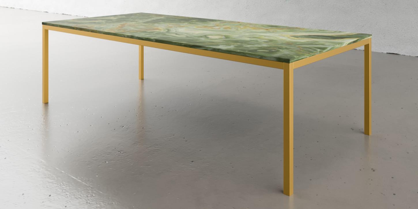 Natürliche Kunst in minimalistischem Design: Der Onyx Green Steintisch nach Maß